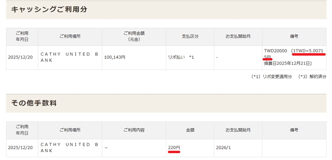 ちなみに数日前にやったエポスのキャッシングは手数料220円込みで1台湾ドル=5.023円でした。