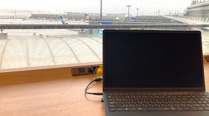 この日はあいにく台風の接近でどしゃ降りでしたが、天気が良ければコーヒーを飲みながら離陸する飛行機をぼんやりと眺めながらくつろぐのもいいです。