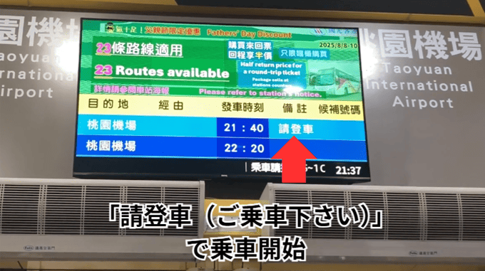 桃園空港発→台北駅行き(所要時間:30~40分):