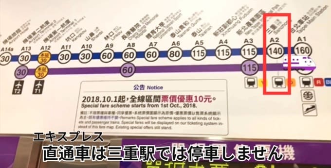 三重駅(A2)は、台北駅(A1)の1つ手前の駅です。