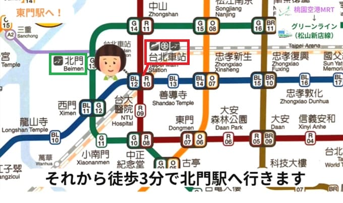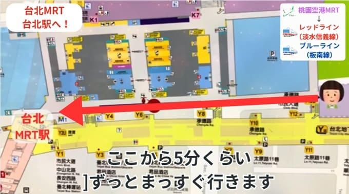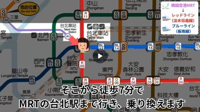桃園空港MRTの台北駅に到着したら、そこから徒歩7分で台北MRTの台北駅まで行き、乗り換えます。