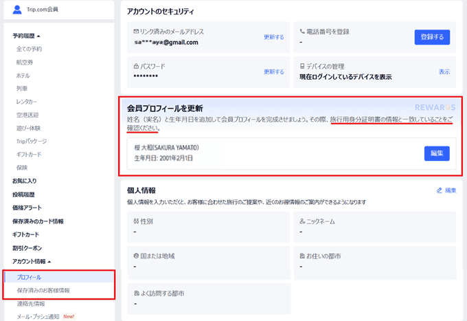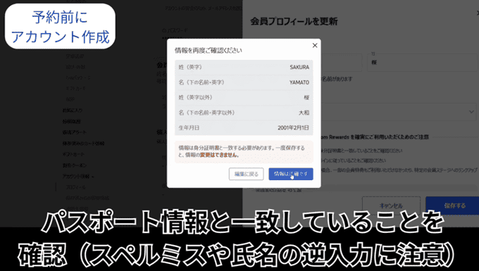 前もって正確な個人情報をアカウントに保存しておけば、実際の予約時に自動で反映してくれるので、スペルミスや数字の打ち間違いを避けるのに役立ちます。