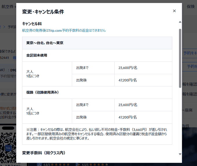 「変更・キャンセル条件を表示」のリンクから条件を確認できます。