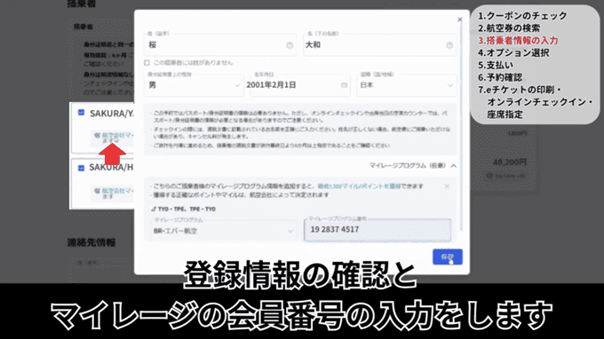 メール認証が済んだら、上の赤枠から搭乗者情報を登録します。