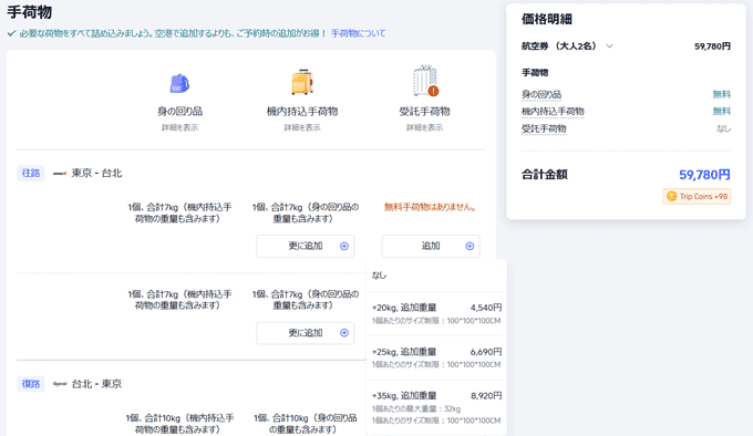 - 預け荷物の重量追加